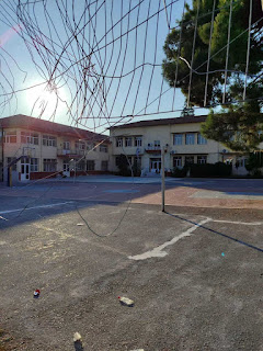 κάγκελα, πεταμένα σκουπίδια στον προαύλιο χώρο. Η λέξη “ΕΛΛΑΣΣ”,