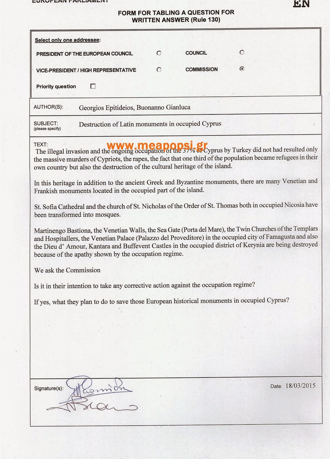 Γραπτή ερώτηση κατέθεσε στην Επιτροπή ο Ευρωβουλευτής του Λαϊκού Συνδέσμου – Χρυσή Αυγή, Στρατηγός Γεώργιος Επιτήδειος, και ο Ιταλός Ευρωβουλευτής της Λέγκας του Βορρά, Gianlouca Buonanno, για την καταστροφή των Λατινικών μνημείων στην κατεχόμενη Κύπρο.