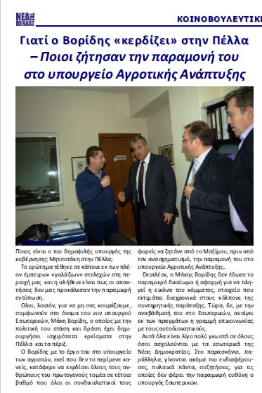Ποιος είναι ο πιο δημοφιλής υπουργός της κυβέρνησης Μητσοτάκη στην Πέλλα; Το ερώτημα τέθηκε σε κάποια εκ των πλέον έμπειρων «γαλάζιων» στελεχών στη περιοχή μας  και η αλήθεια είναι πως οι απαντήσεις δεν μας προκάλεσαν την παραμικρή εντύπωση. Ολοι, λοιπόν, για να μη σας κουράζουμε, συμφωνούν στο όνομα του νυν υπουργού Εσωτερικών, Μάκη Βορίδη, ο οποίος με την πολιτική του στάση και δράση έχει δημιουργήσει ισχυρότατα ερείσματα στην Πέλλα  και τα πέριξ.