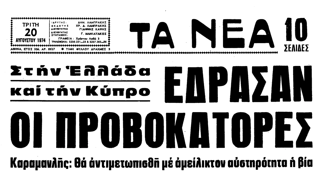 «ΤΑ ΝΕΑ», 20.8.1974, Ιστορικό Αρχείο «ΤΟ ΒΗΜΑ» & «ΤΑ ΝΕΑ»