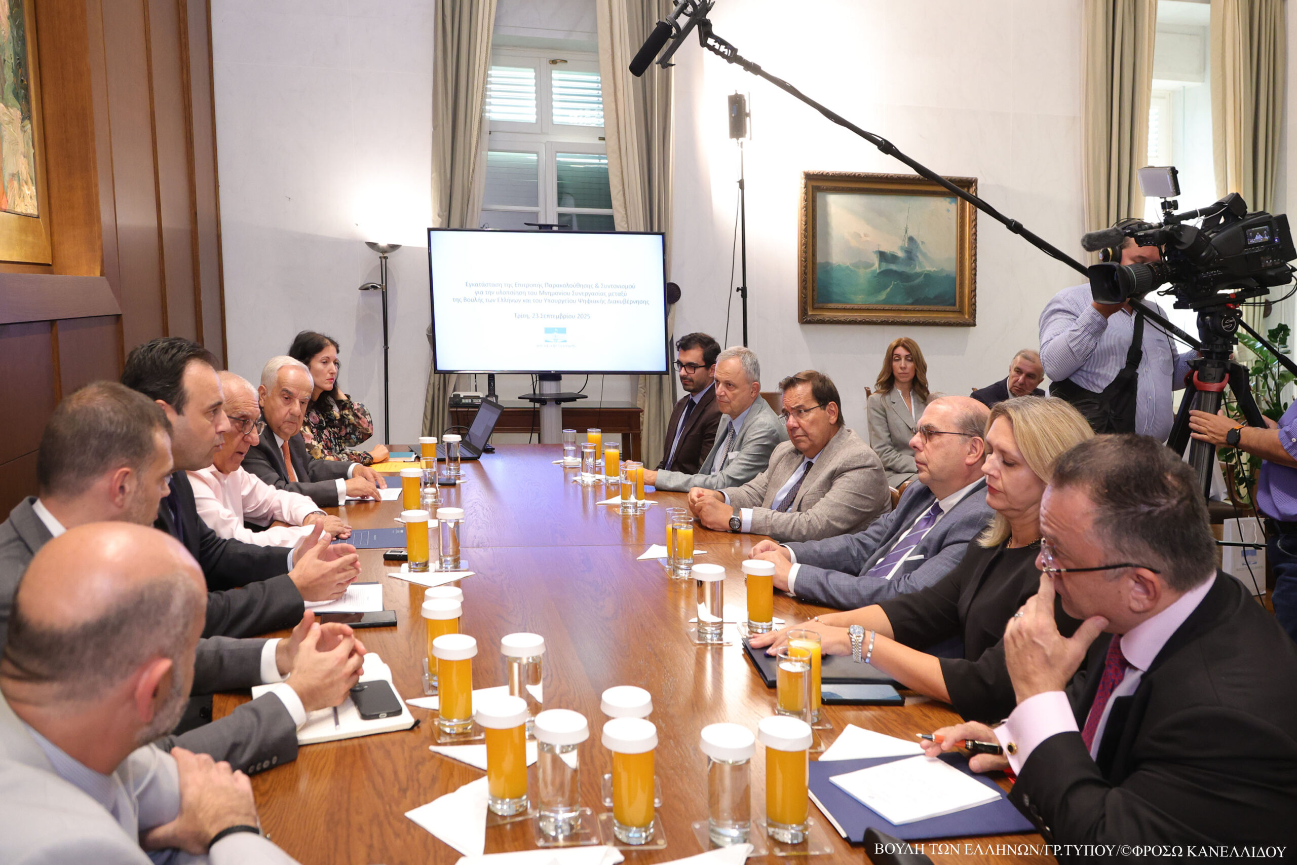 Στη χθεσινή εγκατάσταση της Επιτροπής Παρακολούθησης και Συντονισμού παρέστησαν επίσης ο Γενικός Γραμματέας της Βουλής, κ. Βασίλειος Μπαγιώκος, καθώς και στελέχη των Υπηρεσιών της Βουλής που εργάζονται εντατικά για την υλοποίηση του έργου.