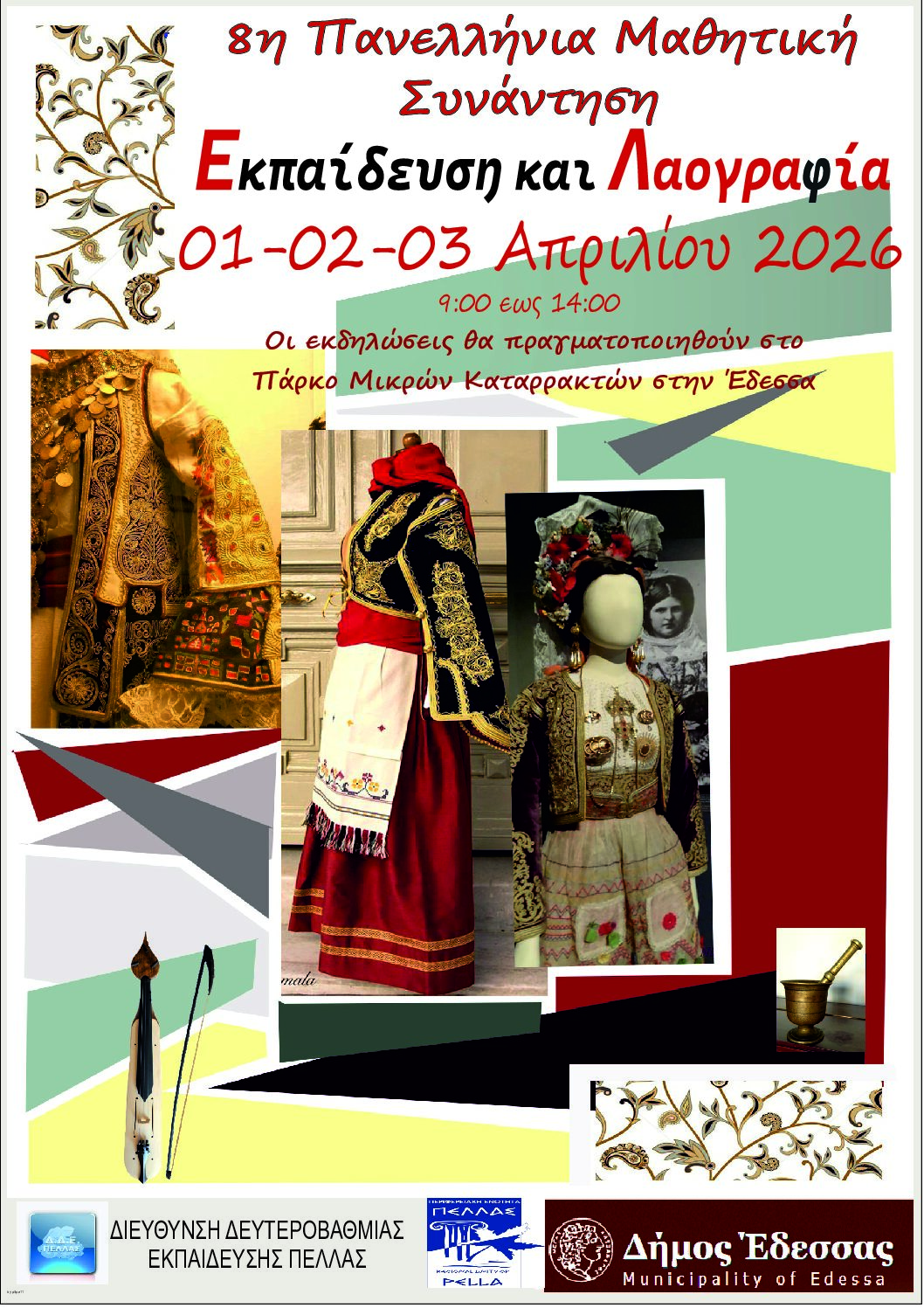 Η Διεύθυνση Δευτεροβάθμιας Εκπαίδευσης Πέλλας η Περιφερειακή Ενότητα Πέλλας και ο Δήμος Έδεσσας διοργανώνουν την 𝟖η Πανελλήνια μαθητική συνάντηση “Εκπαίδευση και Λαογραφία 𝟐𝟎𝟐𝟔” στην Έδεσσα.