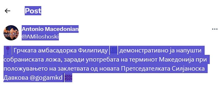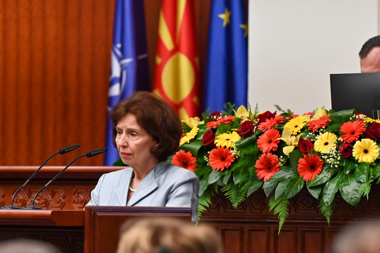 Η Ελληνίδα πρέσβης Σοφία Φιλιπίδου, η οποία παρακολουθούσε τη συνεδρίαση της Συνέλευσης για την ορκωμοσία της Γκορντάνα Σιλιάνοφσκα-Ντάβκοβα ως προέδρου της χώρας, αποχώρησε από την αίθουσα της Ολομέλειας, σε ένδειξη διαμαρτυρίας, διότι η Siljanovska-Davkova, κατά τον πανηγυρικό όρκο, δεν χρησιμοποίησε το συνταγματικό όνομα της χώρας – Δημοκρατία της Βόρειας Μακεδονίας, αλλά χρησιμοποίησε Μακεδονία.