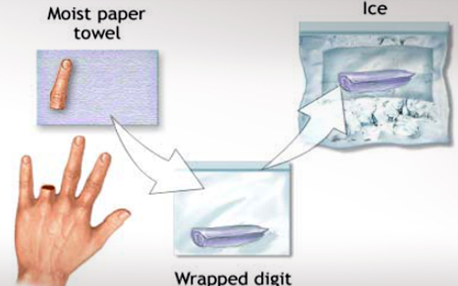 Για να μεταφέρουμε ένα ακρωτηριασμένο μέλος, το καθαρίζουμε προσεκτικά (με σαπουνόνερο και αλατόνερο) και το τυλίγουμε σε καθαρό ύφασμα ελαφρά βρεγμένο. Εάν υπάρχει πάγος, τοποθετούμε παγοκύστη ώστε να κρατιέται σε χαμηλές θερμοκρασίες.