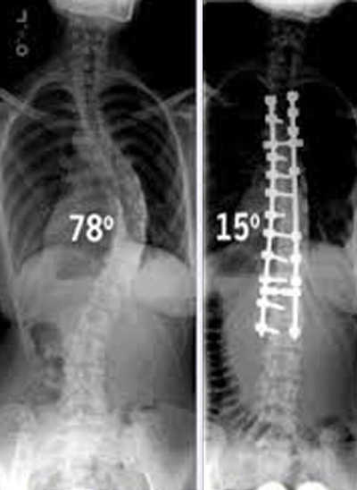 Στις μεγάλες σκολιωτικές γωνίες (πάνω από 45⁰) χρειάζεται εγχείρηση (σπονδυλοδεσία) που σήμερα είναι σχετικά εύκολη και αντιμετωπίζει καίρια το πρόβλημα, ώστε το σώμα ν΄ αποκτά φυσιολογική εμφάνιση.
