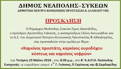 23 Μαΐου στις 8μ.μ. ειδική ενημερωτική εκδήλωση με θέμα «Καρκίνος προστάτη, καρκίνος ουροδόχου κύστεως και καρκίνος νεφρών».