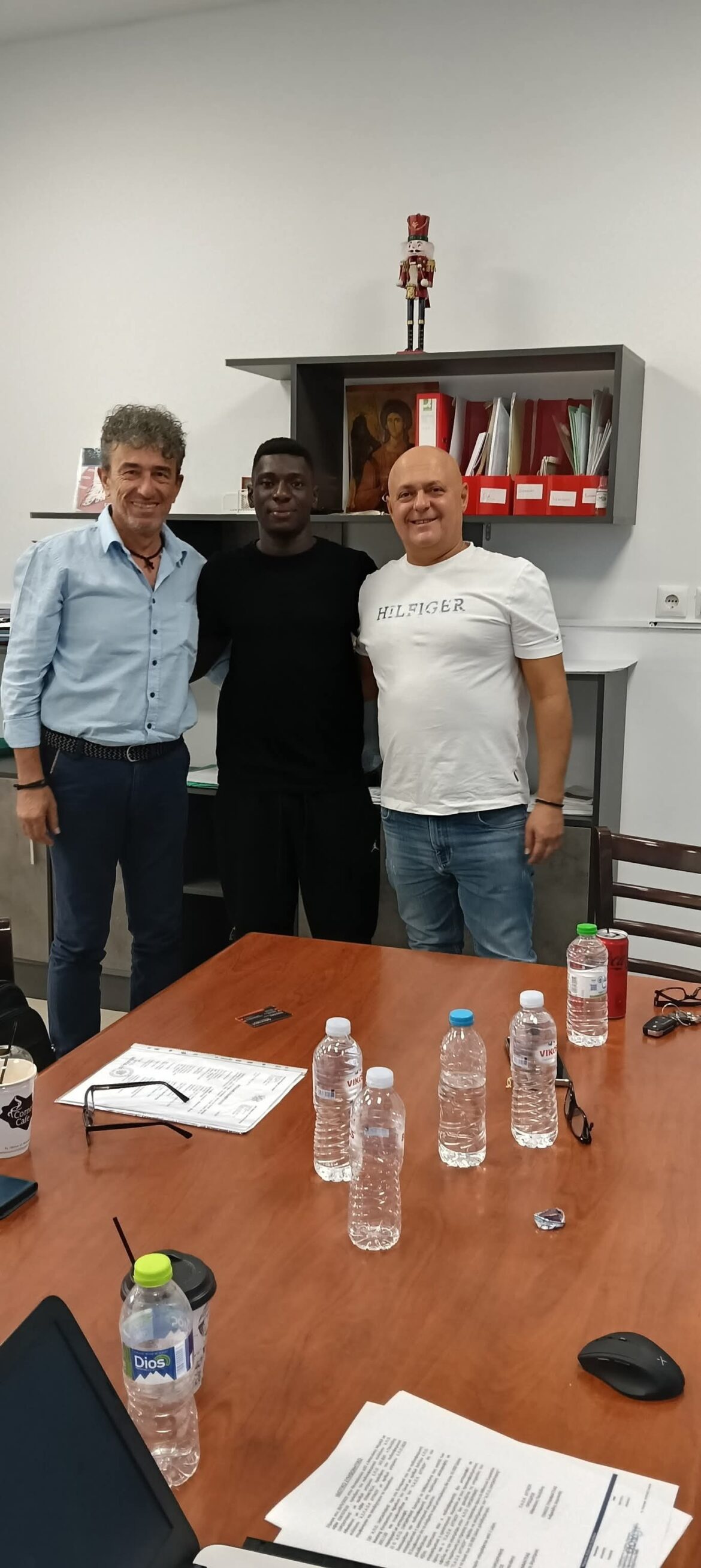 Η συμφωνία για τη μετακίνηση του ταλαντούχου μέσου επισφραγίστηκε σε θερμό κλίμα. Στη φωτογραφία, αποτυπώνεται η στιγμή που οι πρόεδροι των δύο συλλόγων, Μιχάλης Μπενάκης και Αθανάσιος Παυλίδης, έδωσαν τα χέρια. Παρόντες, τιμώντας με την παρουσία τους τη συμφωνία, ήταν και οι Κώστας Κωνσταντινίδης και Χάρης Πεκιαρίδης.