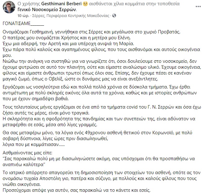 Η Γεσθημανή νοσηλεύτρια στο Γ.Ν. Σερρών περιγράφει τις δύσκολες καταστάσεις που βιώνει μεταφέροντας και το παράδειγμα ενός 49χρονου, ο οποίος βρέθηκε θετικός στον κοροναϊό, ο οποίος της είπε: «σας παρακαλώ πολύ μη με διασωληνώσετε ακόμη, σας υπόσχομαι ότι θα προσπαθήσω να αναπνέω καλύτερα».