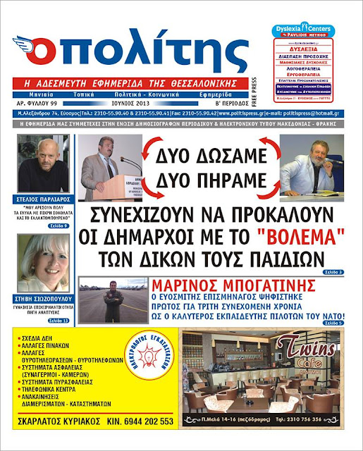 Κυκλοφορεί στην Δυτική Θεσσαλονίκη η ανανεωμένη εφημερίδα Ο Πολίτης  με επίκαιρα θέματα από όλη την περιοχή και κυρίως από τα δρώμενα του Δήμου Ευόσμου. Ο καλός συνάδελφος και ανεξάρτητος Δημοτικός σύμβουλος  Φάνης Παπαδόπουλος πάντα στην πρώτη γραμμή ενημερώνει και πάλι το πολυπληθές αναγνωστικό του κοινό με ειδήσεις που πάντα ξεχωρίζουν. Παρακάτω ακολουθεί το πρωτοσέλιδο της εφημερίδας: