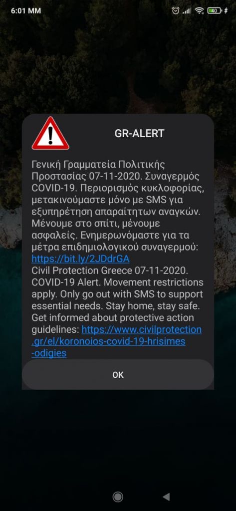 Στο μήνυμα αναφέρεται: «Περιορισμός κυκλοφορίας, μετακινούμαστε μόνο με SMS για εξυπηρέτηση απαραίτητων αναγκών. Μένουμε στο σπίτι, μένουμε ασφαλείας. Ενημερωνόμαστε για τα μέτρα επιδημιολογικού συναγερμού».