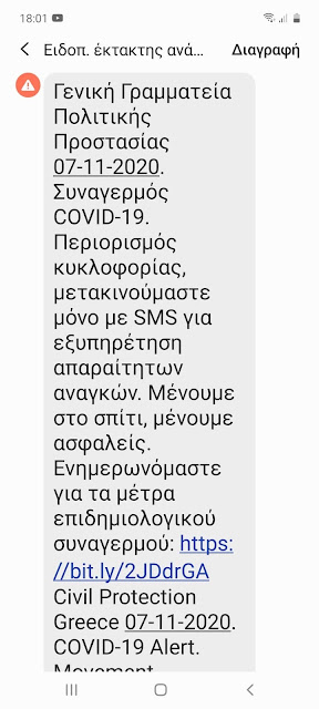 Στο μήνυμα αναφέρεται: «Περιορισμός κυκλοφορίας, μετακινούμαστε μόνο με SMS για εξυπηρέτηση απαραίτητων αναγκών. Μένουμε στο σπίτι, μένουμε ασφαλείας. Ενημερωνόμαστε για τα μέτρα επιδημιολογικού συναγερμού».