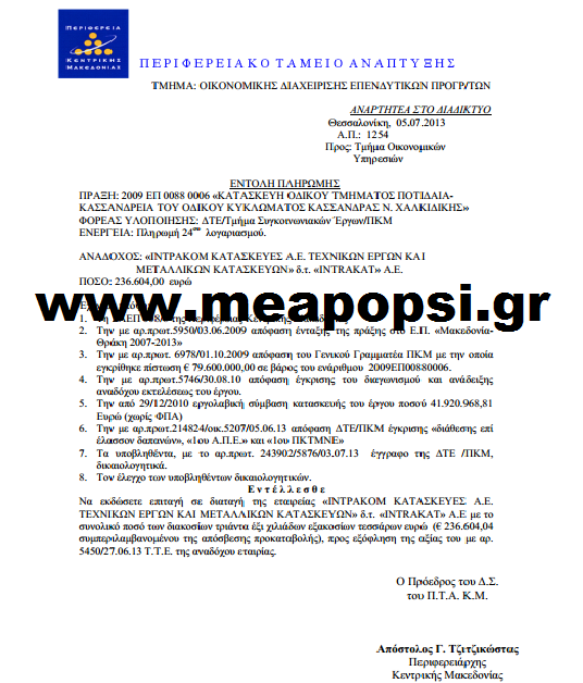 Από την πλευρά της Περιφέρειας Κεντρικής Μακεδονίας,ο Περιφερειάρχης Απόστολος Τζιτζικώστας θέλοντας να επιταχύνει τις εργασίες για την ολοκλήρωση του έργου έδωσε την Παρασκευή 5 Ιουλίου εντολή πληρωμής στο Τμήμα Οικονομικών Υπηρεσιών για την έκδοση της 2ης επιταγής σε διαταγή ύψους διακοσίων τριάντα έξι χιλιάδων εξακοσίων τεσσάρων ευρώ (¤ 236.604,04) στην ανάδοχο εταιρεία του έργου «INTRAKAT» Α.Ε.