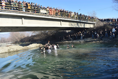 Πάνω στην αυτοσχέδια εξέδρα της γέφυρας, με κατάνυξη εψάλησαν τα καθιερωμένα των Επιφανείων, ενώ κάτω από αυτή βρίσκονταν σε ετοιμότητα