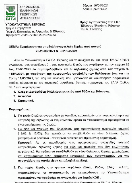 Οι παραγωγοί-αγρότες που έχουν υποστεί μεγάλες καταστροφές από την παγωνιά στα κεράσια, θα μπορούν μέχρι 11 Μαίου να υποβάλουν τις δηλώσεις τους λόγω καταστροφών από τους παγετούς. Μάλιστα έχουν προστεθεί στις αναγγελίες ζημιάς όλες οι ποικιλίες των κερασιών. Οι δηλώσεις στον Δήμο Έδεσσας γινονται στο γραφείο της κας Σίσκου Δήμητρας-Δημαρχείο.Τηλ :2381350790