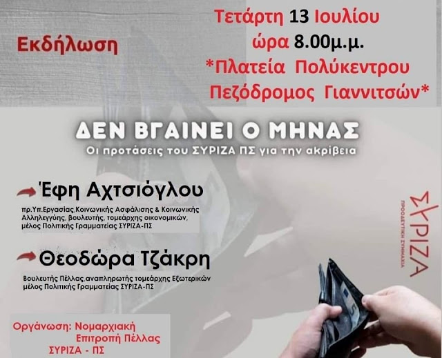 Την Τετάρτη 13/ 7/2022 και ώρα 8 μ.μ. Σας περιμένουμε όλους. Δύο μεγάλες κυρίες, συντρόφισσες και φίλες Έφη Αχτσιόγλου -Effie Achtsioglou και Θεοδώρα Τζάκρη θα είναι κοντά μας. Θέμα της εκδήλωσης η ακρίβεια της “Μητσοτάκης ΑΕ” και οι προτάσεις του ΣΥΡΙΖΑ Π.Σ. Όλοι οι δημοκρατικοί πολίτες πρέπει να είναι εκεί. Το πάρτι της Αγίας οικογένειας με την συμπαράσταση της σημιτικής διαπλοκής πρέπει να τελειώσει. Η αριστερά και η ΔΗΜΟΚΡΑΤΙΚΗ ΠΑΡΑΤΑΞΗ είναι και πάλι εδώ, ενωμένη, Δυνατή. Η πολιτική ΑΛΛΑΓΗ ΘΑ γίνει πράξη.
