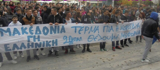 Μαχητική πορεία διαμαρτυρίας στο κέντρο της Κατερίνης πραγματοποίησαν σήμερα στο κέντρο της Κατερίνης μαθητές και μαθήτριες του 2ου ΕΠΑΛ, φωνάζοντας συνθήματα για τα προβλήματα του σχολείου, αλλά και για τη Μακεδονία, αφού ζητούσαν να αποσυρθεί βιβλίο που αποκαλεί τα Σκόπια Μακεδονία και κατέληξαν στο δημαρχείο.Οι μαθητές ζητούσαν από την κυβέρνηση την επίλυση των προβλημάτων που αντιμετωπίζουν στα σχολεία και μαθητική επιτροπή ανέβηκε στο δημαρχείο και είχε συνάντηση με τον αντιδήμαρχο Χρυσόστομο Κυραϊλίδη, μια και ο δήμαρχος απουσίαζε, και του επέδωσαν λίστα με τα προβλήματα τους, τα περισσότερα από τα οποία βέβαια είναι θέμα κυβέρνησης και αφορούσαν βιβλία, λεωφορεία κ.λπ., αλλά και ζήτησαν επίσης την άμεση απόσυρση του βιβλίου ιστορίας της Γ’ Λυκείου, όπου τα Σκόπια εμφανίζονται σε χάρτη του βιβλίου ως Μακεδονία.