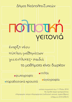 συμμετοχή έως και τις 11 Μαΐου 2018. Τα νέα καλλιτεχνικά τμήματα, για την