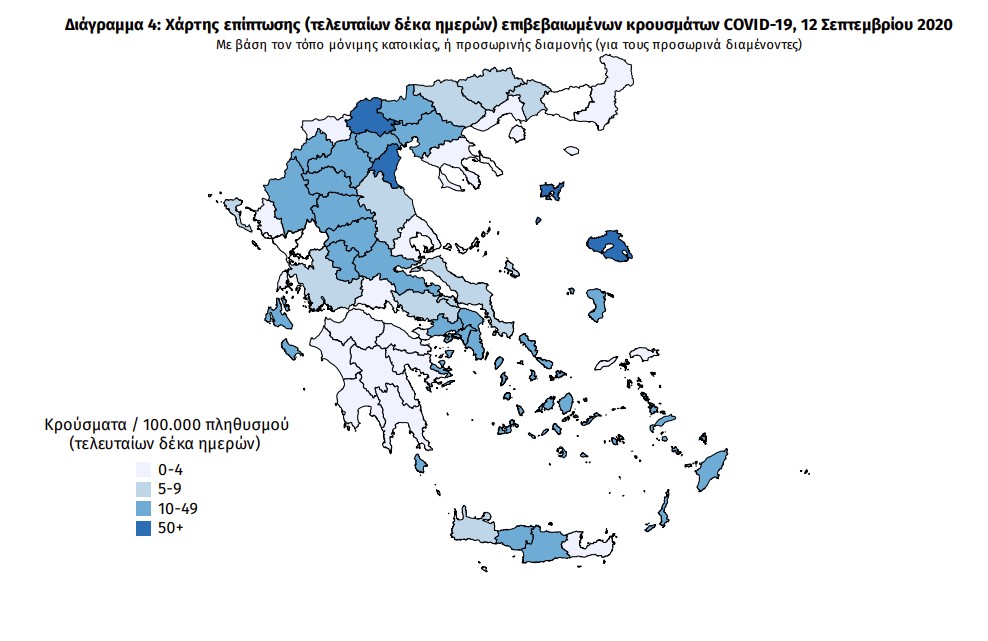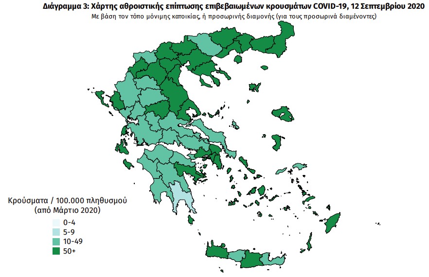 Ο χάρτης αποτυπώνει τη γεωγραφική κατανομή των συνολικών κρουσμάτων COVID-19 (από την αρχή της επιδημίας) ανά Περιφερειακή Ενότητα της χώρας, με βάση την δηλωθείσα διεύθυνση μόνιμης κατοικίας του ασθενούς, ή τη διεύθυνση προσωρινής διαμονής για τους τουρίστες και άλλους προσωρινά διαμένοντες στην Ελλάδα.