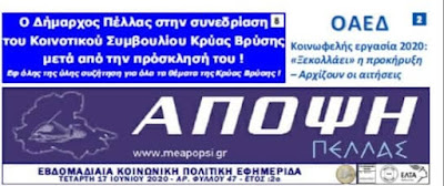 Την περασμένη Τρίτη 9 Ιουνίου το απόγευμα συνεδρίασε το Κοινοτικό Συμβούλιο Κρύας Βρύσης στο δημαρχιακό κτήριο, παρουσία του Δημάρχου Πέλλας κ. Στάμκου. Το παρόν τους έδωσαν και ο Αντιδήμαρχος Δ.Ε. Κρύας Βρύσης Πέτρος Σεραίδης καθώς και ο δημοτικός σύμβουλος κ. Μπαλτζίδης Κων/νος .