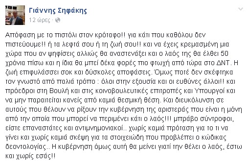 Μέσω ανάρτησής του στον προσωπικό του λογαριασμό στο facebook ο Βουλευτής ΣΥΡΙΖΑ Πέλλας, Γιάννης Σηφάκης μίλησε για το “ναι” που είπε στο νέο μνημόνιο, ενώ έριξε τα βέλη του στους αντιμνημονιακούς του κόμματός του κατηγορώντας τους πως δεν έχουν καμία πρόταση.