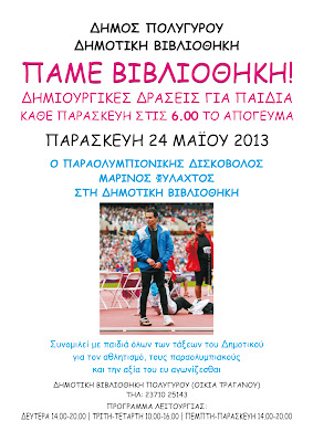 24 Μαΐου 2013, στη Δημοτική Βιβλιοθήκη Πολυγύρου ο παραολυμπιονίκης Μαρίνος