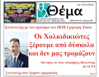 Μια σημαντική συνέντευξη παραχώρησε στην εφημερίδα μας Θέμα της Χαλκιδικής, την μοναδική έντυπη και έγχρωμη σε όλες τις σελίδες της, ο Πρόεδρος της Πανελλήνιας Ένωσης Ξενοδόχων, πρόεδρος της Ένωσης Ξενοδόχων Χαλκιδικής και υποψήφιος Βουλευτής της Νέας Δημοκρατίας το 2019 στην Χαλκιδική, Γρηγόρης Τάσιος. Ο κος Τάσιος μίλησε εφ όλης της ύλης για όλα τα ζητήματα που απασχολούν τον τόπο, για την τουριστική κίνηση, για τα μέτρα της Κυβέρνησης και φυσικά για την επόμενη μέρα στην Χώρα αλλά και στην Χαλκιδική. Διαβάστε παρακάτω όλη την συνέντευξη η οποία είναι ενδιαφέρουσα: