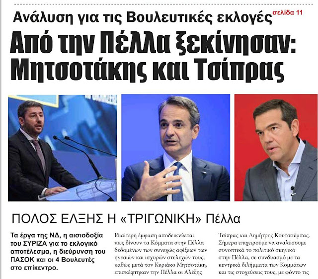 Σε ότι αφορά την Πέλλα, πολιτικά στελέχη θεωρούν ότι ένα το Κόμμα της ΝΔ κρατήσει δυνάμεις, έχοντας επιδείξει έργο στους πολίτες και παράλληλα ο ΣΥΡΙΖΑ παραμείνει στα ποσοστά του 2019 στην περιοχή μας, ή έχει απώλειες λόγω των αυξημένων ποσοστών του ΠΑΣΟΚ, μετά την επιστροφή σημαντικής μερίδας των παραδοσιακών ψηφοφόρων του , το εκλογικό σκηνικό θα είναι «τριγωνικό» στις εκλογές της απλής αναλογικής, χωρίς να είναι δεδομένο πως η ΝΔ θα είναι πρώτη ή θα έχει σαφή διαφορά από τον ΣΥΡΙΖΑ ενώ το ΠΑΣΟΚ θα καλύψει τη μεγάλη του διαφορά με την αξιωματική αντιπολίτευση. Όλα αυτά σε ένα νόμο που διαχρονικά η ΝΔ έχει υψηλά ποσοστά σε σχέση με την κεντροαριστερά και που σε κάποιες αναμετρήσεις είχε υψηλές διαφορές με ΣΥΡΙΖΑ και ΠΑΣΟΚ. Σε αυτό το πλαίσιο στη ΝΔ πατούν στο γεγονός ότι θα υπάρξει υποστήριξη από την Περιφέρεια Κεντρικής Μακεδονίας που είναι γαλάζια και σε επίπεδο Πέλλας καθώς και από τους Δήμους καθώς Χρήστος Μπάτσης στην Αριδαία, Δημήτρης Γιάννου στην Έδεσσα και Γρηγόρης Στάμκος στα Γιαννιτσά στηρίζουν ΝΔ. Όπως και να έχει για τη Νέα Δημοκρατία όπως άλλωστε δήλωσε και ο Πρωθυπουργός σε συνέντευξη του  ότι καμία ψήφος δεν πρέπει να είναι χαλαρή στις εκλογές με απλή αναλογική γιατί αυτές οι κάλπες θα είναι καθοριστικές για την επόμενη μέρα και τη διαμόρφωση του πολιτικού και κυβερνητικού σκηνικού.