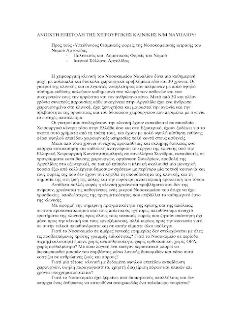 Έχουμε στην Ελλάδα λαμπρούς επιστήμονες που είναι οι ΚΑΛΥΤΕΡΟΙ, χωρίς υπερβολή, της Ευρώπης, και το ΚΡΑΤΟΣ, οι παρατρεχάμενοι του, και τα ΚΟΡΑΚΙΑ, τους δένουν τα χέρια, και ΔΕΝ τους αφήνουν να προσφέρουν τις υπηρεσίες τους στον κόσμο. Έχουμε επίσης εδώ και χρόνια, νοσοκομεία με ΜΟΝΑΔΙΚΟ εξοπλισμό, ο οποίος ΚΑΜΙΑ φορά δε λειτούργησε και σκουριάζει στις κλειστές αίθουσες, ενώ οι ασθενείς, για να κάνουν συγκεκριμένες εξετάσεις, πηγαίνουν ΕΞΩ, σε Ιδιωτικά Συμβεβλημένα Κέντρα.. Διαβάστε αδέλφια την επιστολή, και ΚΑΜΑΡΩΣΤΕ ΤΑ ΧΑΛΙΑ ΜΑΣ.