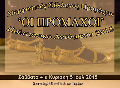 Ο Μ.Χ.Σ. Προμάχων “ΟΙ ΠΡΟΜΑΧΟΙ” σας προσκαλεί στο Ετήσιο Πολιτιστικό Αντάμωμα του, όποιο διοργανώνει το Σάββατο 4 και την Κυριακή 5 Ιουλίου 2015 στο γήπεδο των Προμάχων. Σύλλογοι από την περιοχή αλλά και από όλη την Ελλάδα θα είναι μαζί μας για να σας παρουσιάσουν ένα πλούσιο χορευτικό θέαμα.
