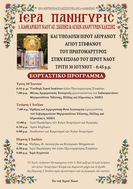 Την Τετάρτη 1 Ιουλίου, μνήμη των αγίων και θαυματουργών Αναργύρων Κοσμά και Δαμιανού, πανηγυρίζει ο ιερός Καθεδρικός ναός Αγίας Σκέπης Εδέσσης. Κατά την διάρκεια του εορτασμού τα πραγματοποιηθεί επίσημη υποδοχή και προσκύνησις ιερού λειψάνου του αγίου Πρωτομάρτυρος Στεφάνου. Το ιερό λείψανο θα παραμείνει στον πανηγυρίζοντα ιερό ναό μέχρι και το βράδυ της Πέμπτης 2 Ιουλίου.
