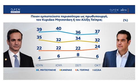 O Κυριάκος Μητσοτάκης εξακολουθεί να θεωρείται ο καταλληλότερος για Πρωθυπουργός καθώς 37% απαντά ότι τον εμπιστεύεται περισσότερο ενώ 24% λέει ότι εμπιστεύεται περισσότερο τον Αλέξη Τσίπρα.