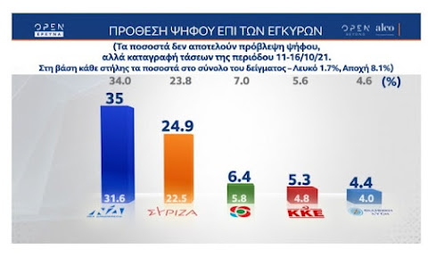 Σε ότι αφορά την νέα δημοσκόπηση η πρόθεση ψήφου η Νέα Δημοκρατία διατηρεί το προβάδισμά της σε διψήφια διαφορά καθώς καταγράφει ποσοστό 35% με τον ΣΥΡΙΖΑ να βρίσκεται στο 24.9%.