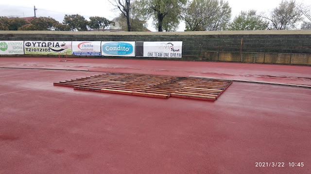 του ελαστικού τάπητα (ταρτάν) καθώς και για σημειακή επισκευή φθορών στον υπόλοιπο στίβο, παρέμβαση που καθυστερεί λόγω των καιρικών