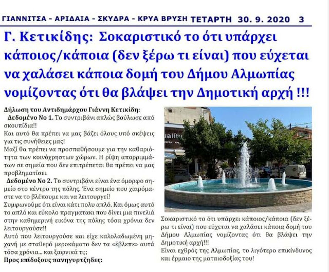 Σοκαριστικό το ότι υπάρχει κάποιος/κάποια (δεν ξέρω τι είναι) που εύχεται να χαλάσει κάποια δομή του Δήμου Αλμωπίας νομίζοντας ότι θα βλάψει την Δημοτική αρχή!!!
