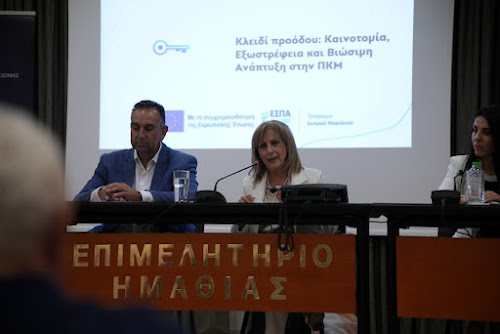 Η Περιφερειάρχης Κεντρικής Μακεδονίας, Αθηνά Αηδονά, παρουσίασε στην Ημαθία δύο νέες, σημαντικές δράσεις ενίσχυσης της επιχειρηματικότητας, οι οποίες χρηματοδοτούνται από το ΕΣΠΑ της Περιφέρειας Κεντρικής Μακεδονίας. Η κεντρική εκδήλωση φιλοξενήθηκε στο Επιμελητήριο Ημαθίας στη Βέροια, ολοκληρώνοντας τον κύκλο ενημερωτικών παρουσιάσεων σε όλες τις Περιφερειακές Ενότητες.