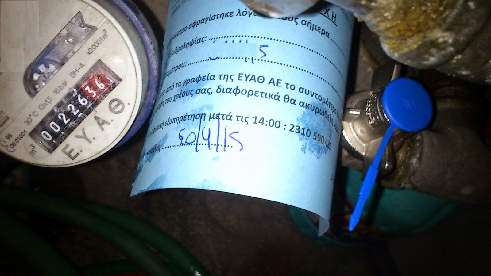 Μετά τις χιλιάδες διακοπές ρευμάτων από τη ΔΕΗ που συνεχίζονται, η ΕΥΑΘ ακολουθεί παρόμοια εκβιαστική πολιτική, προχωρώντας σε μαζικές διακοπές υδροδότησης σε εκατοντάδες οικογένειες οι οποίες αποδεδειγμένα αντιμετωπίζουν πρόβλημα (άνεργοι, μονογονεικές, ανάπηροι κτλ). Περισσότερες από πενήντα (50!) διακοπές υδροδότησης καθημερινά με τραγικά αποτέλεσμα όπως φαίνεται στις παρακάτω φωτογραφίες ( http://epitropidrasisds.blogspot.gr ) όπου στις 20/4 έκοψαν το νερό σε τρία από τα οχτώ διαμερίσματα πολυκατοικίας!