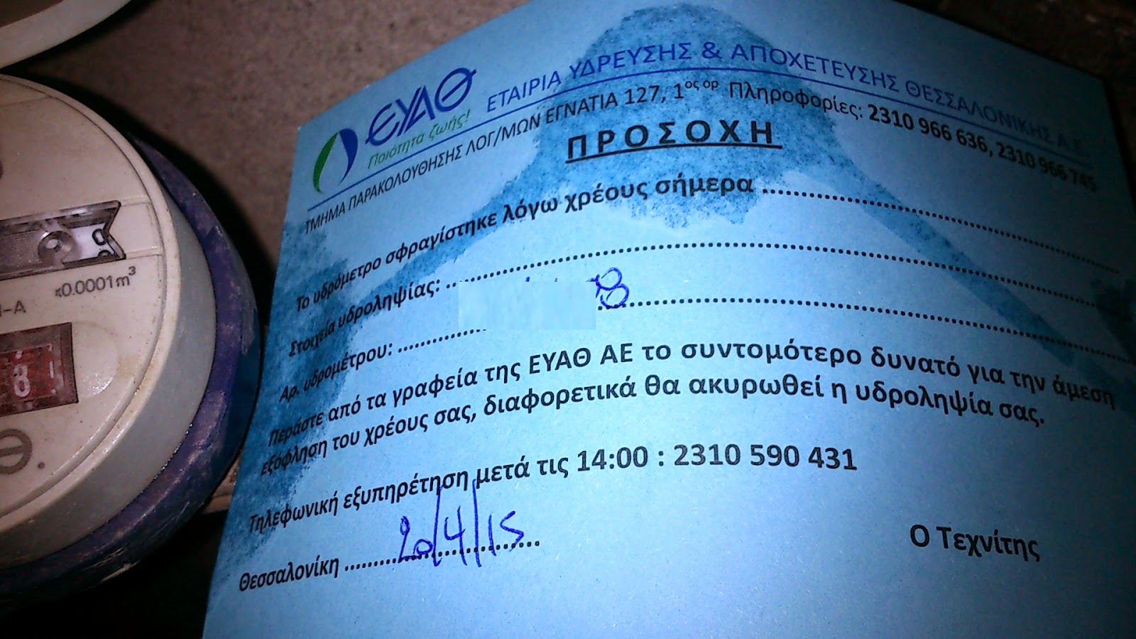 Μετά τις χιλιάδες διακοπές ρευμάτων από τη ΔΕΗ που συνεχίζονται, η ΕΥΑΘ ακολουθεί παρόμοια εκβιαστική πολιτική, προχωρώντας σε μαζικές διακοπές υδροδότησης σε εκατοντάδες οικογένειες οι οποίες αποδεδειγμένα αντιμετωπίζουν πρόβλημα (άνεργοι, μονογονεικές, ανάπηροι κτλ). Περισσότερες από πενήντα (50!) διακοπές υδροδότησης καθημερινά με τραγικά αποτέλεσμα όπως φαίνεται στις παρακάτω φωτογραφίες ( http://epitropidrasisds.blogspot.gr ) όπου στις 20/4 έκοψαν το νερό σε τρία από τα οχτώ διαμερίσματα πολυκατοικίας!