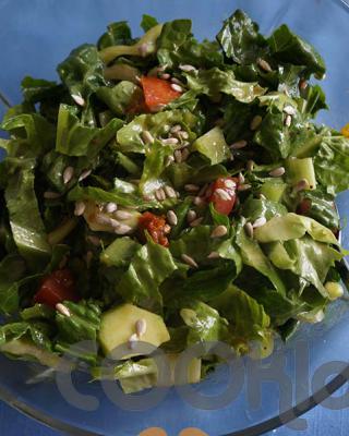 ξεπλένουμε, τις προσθέτουμε απευθείας στο μαρούλι. - Προσθέτουμε το αγγούρι, τις πιπεριές, τη ντομάτα, τους ηλιόσπορους, αλάτι, πιπέρι και την βινεγκρέτ.