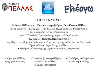 Το 2ο Συνέδριο Προσομοίωσης Δημοτικού Συμβουλίου “Εν Έργω | Πράξη Δημοκρατίας” είναι προ των πυλών. Την Πέμπτη 29 Μαρτίου και ώρα 18.45 σας περιμένουμε όλες και όλους στην αίθουσα του Δημοτικού Συμβουλίου Πέλλας στο Δημοτικό Μέγαρο Γιαννιτσών για να συμφωνήσουμε και αυτή τη χρονιά πως τα νιάτα του Δήμου Πέλλας είναι ανήσυχα και σε συνεχή επαγρύπνηση.