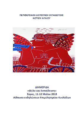 Η Περιφερειακή Διεύθυνση Πρωτοβάθμιας και Δευτεροβάθμιας Εκπαίδευσης Νοτίου Αιγαίου, σε συνεργασία με το Ινστιτούτο Εκπαιδευτικής Πολιτικής και τη Γενική Γραμματεία Ισότητας των Φύλων, έχουν την τιμή να σας προσκαλέσουν στη Διημερίδα με θέμα Φύλο και Εκπαίδευση η οποία θα πραγματοποιηθεί στην Ερμούπολη, στις 11 Μαΐου (ώρες 11.00-14.30) και στις 12 Μαΐου (ώρες 9.30-14.00), στην Αίθουσα εκδηλώσεων Επιμελητηρίου Κυκλάδων (Απόλλωνος και Λαδοπούλου).