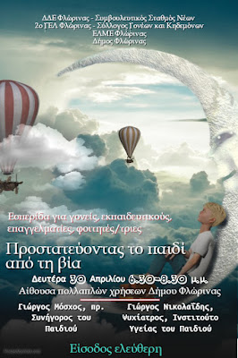 το παιδί από τη βία», η οποία θα πραγματοποιηθεί τη Δευτέρα 30 Απριλίου, στις 6.30, στην Αίθουσα Πολλαπλών Χρήσεων του
