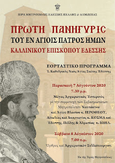 Η Ιερά Μητρόπολις Εδέσσης, Πέλλης και Αλμωπίας ανακοινώνει ότι ο πρώτος πανηγυρικός εορτασμός της ιεράς μνήμης του Αγίου Καλλινίκου Μητροπολίτου Εδέσσης, Πέλλης και Αλμωπίας θα πραγματοποιηθεί στις 7 και 8 Αυγούστου 2020 στον Ιερό Καθεδρικό Ναό Αγίας Σκέπης Εδέσσης με την συμμετοχή των Σεβασμιωτάτων Μητροπολιτών Ναυπάκτου και Αγίου Βλασίου κ. Ιεροθέου, Αιτωλίας και Ακαρνανίας κ. Κοσμά και του οικείου ποιμενάρχου κ. Ιωήλ καθώς και του ιερού κλήρου της Ι. Μητροπόλεως σύμφωνα με το εξής πρόγραμμα:
