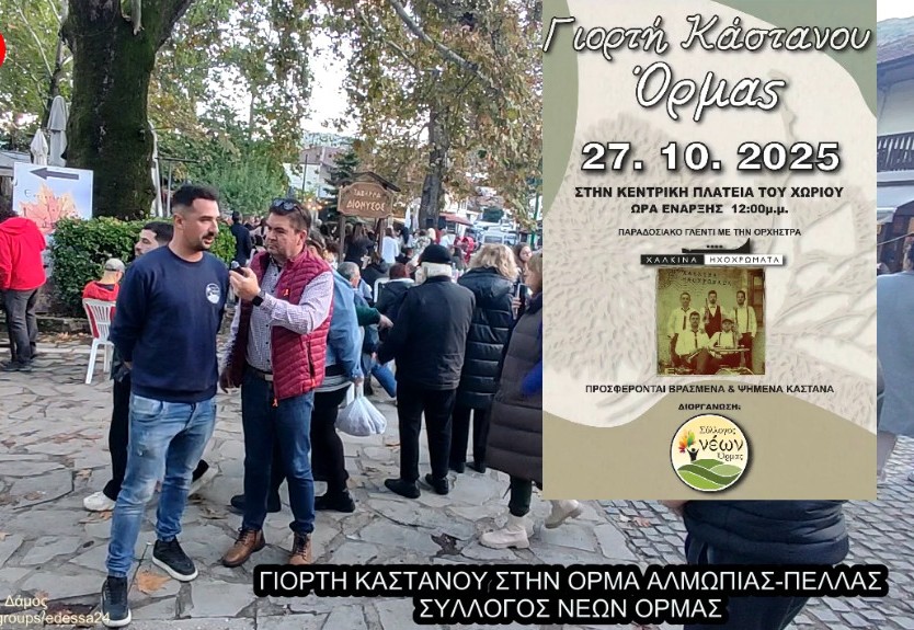 Όρμα, Πέλλα, 30 Οκτωβρίου 2025 – Με απόλυτη επιτυχία και ρεκόρ επισκεπτών ολοκληρώθηκε η 18η Γιορτή Κάστανου στην πανέμορφη Όρμα της Αλμωπίας, την Δευτέρα 27 Οκτωβρίου 2025. Εκατοντάδες επισκέπτες από διάφορα μέρη της Ελλάδας κατέκλυσαν ασφυκτικά το χωριό, τιμώντας την παράδοση και τη γεύση.