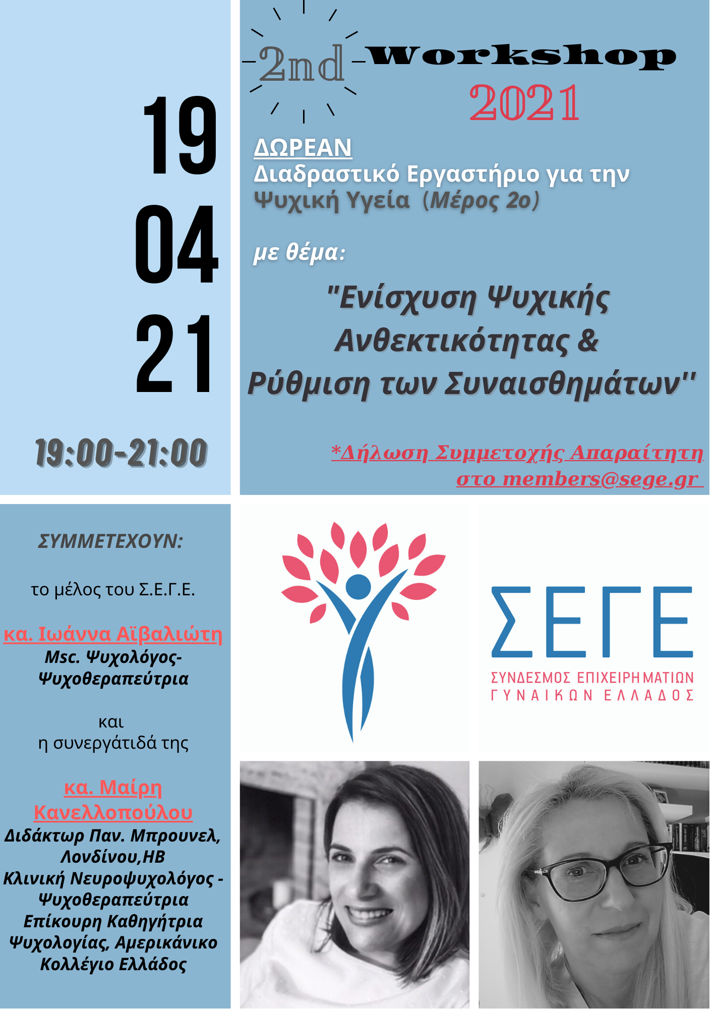 Αυτή τη Δευτέρα 19 Απριλίου 2021 συνεχίζοντας με το αρχικό θέμα του 1ου Εργαστηρίου “Η γυναικεία ματιά στη διαχείριση της πανδημίας“, είναι η σειρά να ασχοληθούμε με την ενσυνειδητότητα και την αναγνώριση και ρύθμιση του συναισθήματος μας, να αναγνωρίσουμε τον φαύλο κύκλο των αρνητικών σκέψεων και να ενισχύσουμε την ψυχική μας ανθεκτικότητα.