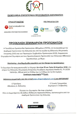 Η Πανελλήνια Ομοσπονδία Προπονητών Αθλημάτων (ΠΟΠΑ), σε συνεργασία με την Ακαδημία Προπονητών της Κολωνίας και υπό την αιγίδα της Ελληνικής Ολυμπιακής Επιτροπής (ΕΟΕ) και του Παγκοσμίου Συμβουλίου Προπονητών (ICCE), διοργανώνει Επιμορφωτικό Σεμινάριο για τους :