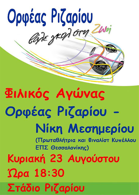Με ένα δυνατό φιλικό αγώνα ξεκινάει ο Ορφέας Ριζαρίου. Την Κυριακή 23 Αυγούστου και ώρα 18:30 θα υποδειχθεί την Νίκη Μεσημερίου μία ομάδα που αγωνίζεται στην Α1 της ΕΠΣ Μακεδονίας και ήταν φιναλίστ στον τελικό κυπέλλου χάνοντας μάλιστα το κύπελλο στα πέναλτι. Η Νίκη Μεσημερίου Θεσσαλονίκης πολλή δυνατή ομάδα που έχει στο δυναμικό της πολλούς αξιόλογους παίκτες. Πριν την έναρξη του αγώνα θα γίνει και αγιασμός εν όψη της νέας αγωνιστικής χρονιάς. Η Διοίκηση του Ορφέα Ριζαρίου εύχεται σε όλες τις ομάδες και τους παίκτες επιτυχία στους στόχους τους χωρίς τραυματισμούς.