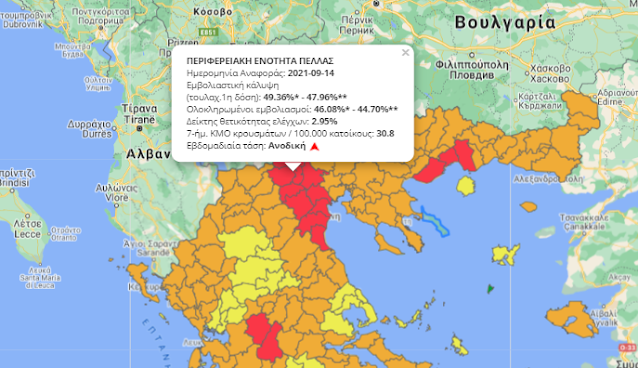 Στον διαδραστικό επιδημιολογικό χάρτη μεταξύ άλλων φαίνεται και η εμβολιαστική κάλυψη με τουλάχιστον μία δόση στην Πέλλα, που είναι μεταξύ 49.36% – 47.96%, ο δείκτης θετικότητας που ανέβηκε στο 2.95%, ο 7 ήμερος κινητός μέσος όρος κρουσμάτων ανά 100.000 κατοίκους που είναι 30,8 και η εβδομαδιαία τάση η οποία είναι ανοδική.