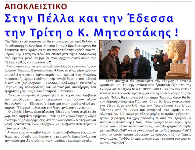 Την Τρίτη εκτός απροόπτου θα επισκεφτεί το νομό Πέλλας, ο Πρωθυπουργός Κυριάκος Μητσοτάκης. Ο Πρωθυπουργός θα βρίσκεται στην Πράγα όπου θα παραστεί στην κηδεία του πεθερού. Την Τρίτη το πρωί θα επισκεφτεί την Θεσσαλονίκη ενώ αμέσως μετά θα βρεθεί στον Αρχαιολογικό Χώρα της Πέλλας καθώς και το μουσείο!!! Εκει αναμένεται να αναφερθεί στην έναρξη κατασκευής του δρόμου Έδεσσας Θεσσαλονίκης. Άλλωστε είναι θέμα χρόνου αποτελεί ο πρώτος διαγωνισμός που  αφορά στη «Μελέτη, Κατασκευή, Χρηματοδότηση της Αναβάθμισης του οδικού άξονα ΕΟ2 (Μαυροβούνι – Έδεσσα, Παράκαμψη Γιαννιτσών, Παράκαμψη Χαλκηδόνας) και λειτουργία/ συντήρηση του τμήματος γέφυρας Αξιού ποταμού – Έδεσσας».