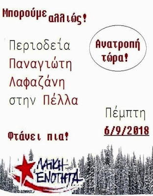 Περιοδεία στον Νομό Πέλλας θα πραγματοποίηση ο Γενικός Γραμματέας τού πολιτικού συμβουλίου τής Λαϊκής ενότητας ( ΛΑ,Ε ) ΠΑΝΑΓΙΩΤΗΣ ΛΑΦΑΖΑΝΗΣ ξεκινώντας από την Έδεσσα στης 9,00 πμ – 11.00 πμ όπου θα συναντηθεί με νεολαίους της πόλης και θα περιοδεύσει στα μαγαζιά. Από τις 11.00– 12,30 θα παραχωρήσει συνέντευξη τύπου στο πολιτιστικό κέντρο στην περιοχή Βαρόσι σέ ΜΜΕ τού Νομού και στη συνέχεια θα ακολουθήσει περιοδεία στην Σκύδρα όπου και θα μιλήσει με αγρότες και επιχειρηματίες της πόλης ενώ τέλος θα κατευθυνθεί στα Γιαννιτσά όπου θα περιοδεύσει στα μαγαζιά και θα μιλήσει στην Πέλλα τηλεόραση.