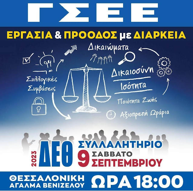 Η ΓΣΕΕ συνεχίζοντας τον αγώνα για την προάσπιση των δικαιωμάτων του κόσμου που εκπροσωπεί, καλεί τους εργαζόμενους τους συνταξιούχους και τους ανέργους στο Συλλαλητήριο Διαμαρτυρίας στη Θεσσαλονίκη, το οποίο διοργανώνει από κοινού με το Εργατικό Κέντρο της πόλης, το Σάββατο 9 Σεπτεμβρίου στις 6 το απόγευμα στο άγαλμα Βενιζέλου.